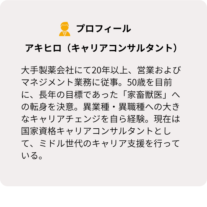 大手製薬会社で20年以上キャリアを積んできましたが、40代半ばになって「もっと自分に向いている仕事をしたい」と一念発起し、まったく未経験だった家畜獣医の世界に飛び込みました。